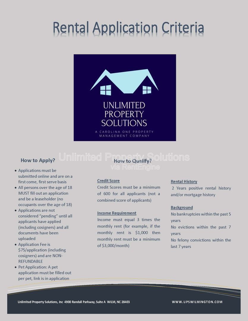 YOU MUST COMPLETE THE PET SCREENING PROCESS IF YOU HAVE A PET/SERVICE ANIMAL/ASSISTANCE ANIMAL. Please go to upswilmington.petscreening.com to begin the process. This is a third-party service, Pet Screening, to ensure all applicants understand how to adhere to the property's pet and animal policies. There will be a monthly pet rent per pet. The amount of the pet rent is determined based on a paw score that Pet Screening assigns to your pet.