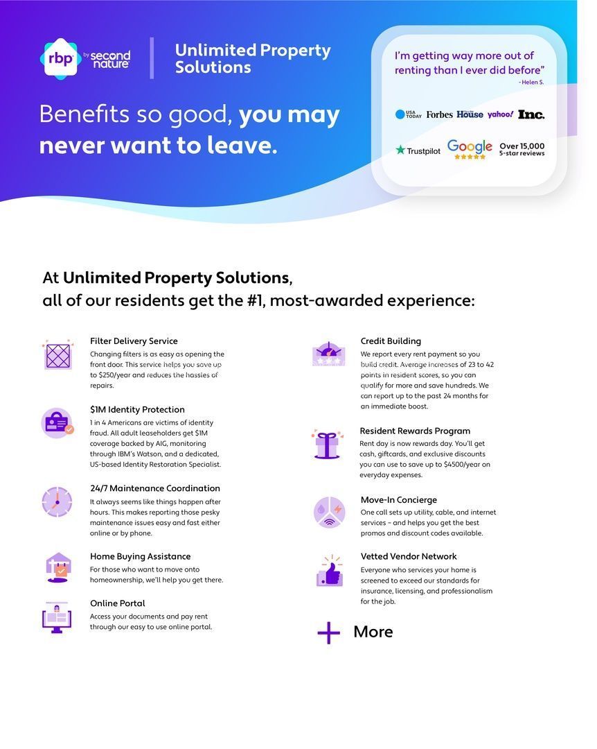 Leasing through us will provide you with a Resident Benefits Package! You will receive RENT REWARDS for paying rent on time! We will help you boost your credit score! Air Filters are shipped directly to your door! You will receive $1M in Identity Protection! You will be enrolled in an On Demand Pest Control service! You will be covered in our Liability to Landlord Insurance program! You can use the Utility Concierge Program to help you set up utilities! The Resident Benefits Package is $62/month and is required for all Unlimited Property Solutions residents.